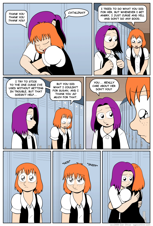 This isn't a new hair style for Catalina in this comic. This is what happens when Catalina doesn't take the time to properly style her hair and make it obvious to all that she is essentially a catgirl minus the cat ears and tail. I believe I have mastered the art of drawing characters who invoke a need for people to hug them. This isn't a huge ego talking; it's the fact that, even while drawing this comic, I felt a near overwhelming urge to hug Catalina in a feeble attempt to make everything okay. Speaking of which, panel five combined with Catalina's "cat-ness" keeps making me think of Lolcats. It makes me want to add the caption "Can I has a hug?", which would no doubt make [[2008-04-18|Raven slap me upside the head]].