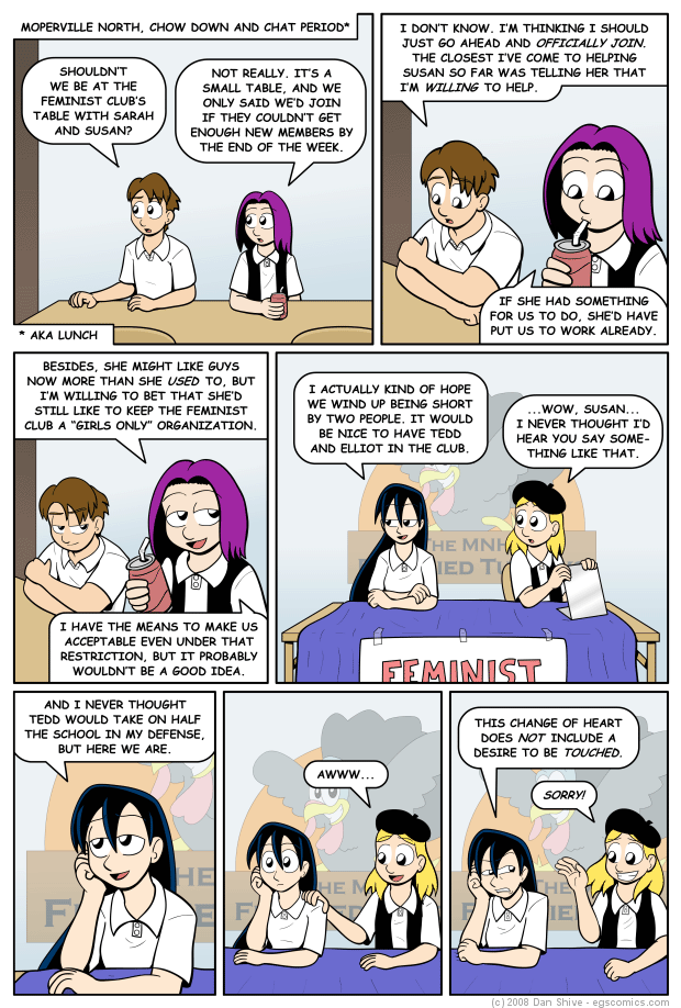 As much as I like using color for the characters in EGS, I still fret over what colors to use for backgrounds. I originally had an off-white color for the background in an attempt at what I remembered my own high school walls being like, but it just didn't look good in the comic. I find myself torn between what would be appropriate for the location in real life and what would look good in the comic. Another sign that I need more practice.