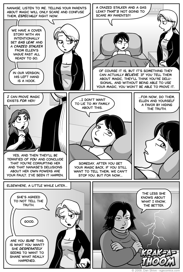El Goonish Shive Introductions The Goo Shade, Part 1 Q&A #1 Shade, Part 2 Relations, Part 1 April Fools Week Relations, Part 2 Catnip Sister Part 1 - Open The Box Part 2 - Read The Rules Part 3 - Set Up The Pieces Part 4 - Play The Game Part 5 - Knock The Board Over Part 6 - Scattered Pieces Part 7 - Fist Fight Part 8 - Clean Up New And Old Friends Flipping Cardboard Lady Mysterious II slooF lirpA Squirrel Diplomacy Lunchtable Revelations Night Out Part 1 - Martial Arts Crew Part 2 - Elliot's Crew Part 3 - Ellen's Crew The Morning After Q&A #2 Tam Eh Tedd Painted Black Part 1 - Walk In The Park Part 2 - Missing Persons Part 3 - Interviewed By The Devil Part 4 - Into The Dungeon Part 5 - The Truth About Grace Part 6 - The Brewing Storm Part 7 - Fallen From Grace Part 8 - Humanity PB Special Features Shadows After Dark Sleepy Time Second Life The Child Left Behind Red Alert Before The Party Moping Squirrel Intro to South Party Recruiting Even More Recruiting Party Fashion Family Reuinion Grace's Birthday Party Part 1 - Arrivals And Presents Part 2 - Bending Genders Part 3 - Festivities Part 4 - Hold On Hope The After Party Q&A #3 Hidden Genesis Hidden Genesis In The Shadows The New Students Susan Draws The Line Squirrel In The Classroom Sister 2 Part 1 - The Trials Of Susan Part 2 - The Statue Part 3 - Pent-Up Magic Part 4 - Evil Monkey Part 5 - Moperville News Part 6 - Weregirl Part 7 - The Dark Clouds Gather Part 8 - Talon vs. Scythe Part 9 - Wrath of God Part 10 - Pandoras Box Q&A #4 Q&A #4 Bringing Silly Back Indiana Elliot And The TOSF T-Minus The Demon Ally Hammerchlorians - 1 Hammerchlorians - 2 Hammerchlorians - 3 T-Minus Dark Allegiance New And Old Flames - 1 New And Old Flames - 2 New And Old Flames - 3 New And Old Flames - 4 New And Old Flames - 5 New And Old Flames - 6 Q&A #5 Q&A #5 9001% Serious One Way Road Legends of Celida Death Sentence - 1 Death Sentence - 2 Death Sentence - 3 Death Sentence - 4 Death Sentence - 5 What Is Love Summer The End Of Spring Power Fantasy Rocks Fall Nobody Is Hired Nepotism Hair By The Numbers Duel Of The Discs There Be Whales Here There Be Whales Here Pt 2 There Be Whales Here Pt 3 The Dawn End Of An Era End Of An Era pt 2 Family Tree Family Tree Part 2 - Arrival Family Tree Part 3 - Par-TAY Family Tree Part 4 - Weirdness Family Tree Part 5 - A Troll Family Tree Part 6 - Banhammered Family Tree Part 7 - Hangover Q&A #6 Identity Identity Part 2 - Reactions Identity Part 3 - Cat Attack Identity Part 4 - Detective Sarah Identity Part 5 - Basement Chat Identity Part 6 - ILLOGICAL! Identity Part 7 - Dreams identity Part 8 - Ashley Identity Part 9 - Detective Susan Identity Part 10 - Ashley and Elliot Identity Part 11 - Epilogue Summer Moments Guest Comics Guest Comics #1 Guest Comics #2 Pandoras Box Squirrel Prophet SP - Part 2 SP - Final Battle So A Date At The Mall So A Date - Part 2 So A Date - Part 3 So A Date - Part 4 So A Date - Part 5 EGSNP - Question Mark Q&A 7 - The Requestioning Sister 3 - Catspaws Part 1 - Legacy Part 2 - The Will of Magic Part 3 - Reply Hazy Part 4 - Everyone Needs To Talk Part 5 - The Reservoir Part 6 - Maybe Sisters Part 7 - An Unkindness Part 8 - Awkwardness Ahead Part 9 - Traffic Freeze Part 10 - Fluidity Part 11 - All Of The Curse Words Part 12 - Misanthropy Part 13 - In Search Of Wisdom Part 14 - Sister Anxiety Part 15 - Elliot and Ellen Part 16 - BFFs Part 17 - Great Fairy Godmother Part 18 - Gathering Monsters Part 19 - Family Meetings Part 20 - Geminis Part 21 - The Other Dunkel Part 22 - Apocalypse Part 23 - The Fate Of Magic Part 24 - Elliots And Ellens Part 25 - Changes Part 26 - Epilogues The New World The Legend of Diane The Secret of Sam Q&A 8 - The Lord Of The Q&As Title Pending Title Pending 2 - Even More Pending Title Pending 3 - Untitled Party Title Pending 5 or 6 Balance Part 1 Part 2 Part 2-B Part 3 Part 4 Part 5 Part 6 Part 7 Part 8 Part 9 The Road Ahead Brother Father Our Future Recruitment Layers, Part 1 Layers, Part 2 Layers, Part 3 Layers, Part 4 Hope, Part 1 Hope, Part 2 Hope, Part 3 Hope, Part 4 Hope, Part 5 Hope, Part 6 Hope, Part 7 Hope, Part 8 Hope, Part 9 Hope, Part 10 Hope, Part 11 Hope, Part 12 False Kings False Kings, Part 1 False Kings, Part 2 False Kings, Part 3 False Kings, Part 4