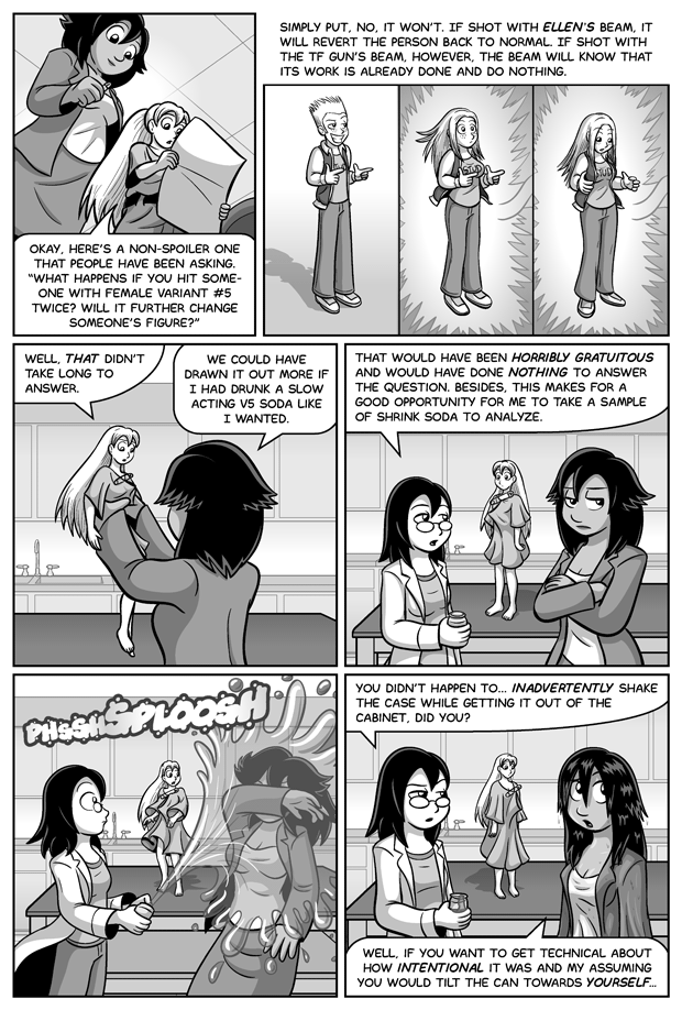Again for the record, Amanda goes from 50% normal size to 36% normal size during the course of this comic. Lisa is a little under 94% in the last panel, making her briefly the same size as Chika. Chika and Lisa are proportioned the same (head-height wise, anyway), so Lisa looks more natural here than Amanda did when she was equal height to Lisa (Amanda is 6.5 "heads" tall while Lisa and Chika are both 6, so 5' 4" Amanda looks odd next to 5' 4" Lisa).