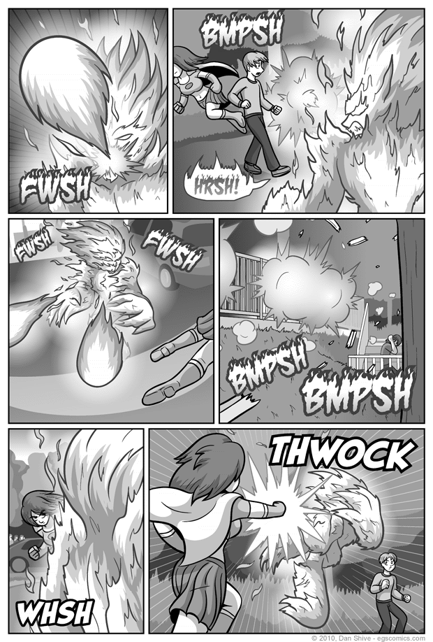 Panel four, on the other hand, is pretty much exactly as I pictured it. Well, not EXACTLY. The drawings in my head are done by a master I cannot match, but the positioning and angle and stuff is pretty much spot on. Those fireballs might not be "fire", but they can do some damage.