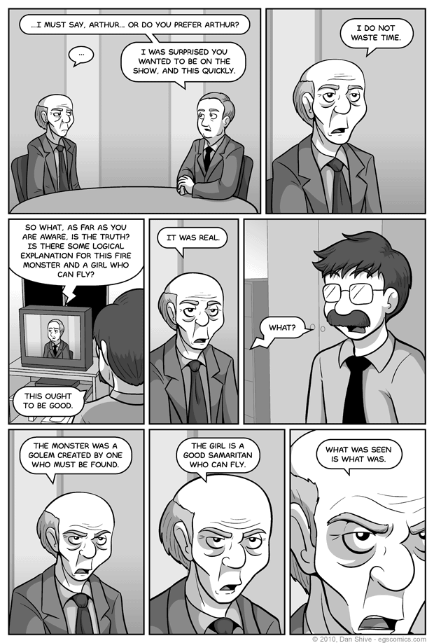 I have decided I enjoy writing for Arthur, mostly because his statement in panel two is entirely true. The basic strategy is "write a sentence, then make it as blunt as possible without losing its meaning." Adjectives fled in fear, elaborations perished... it's like a butcher's approach to editing.