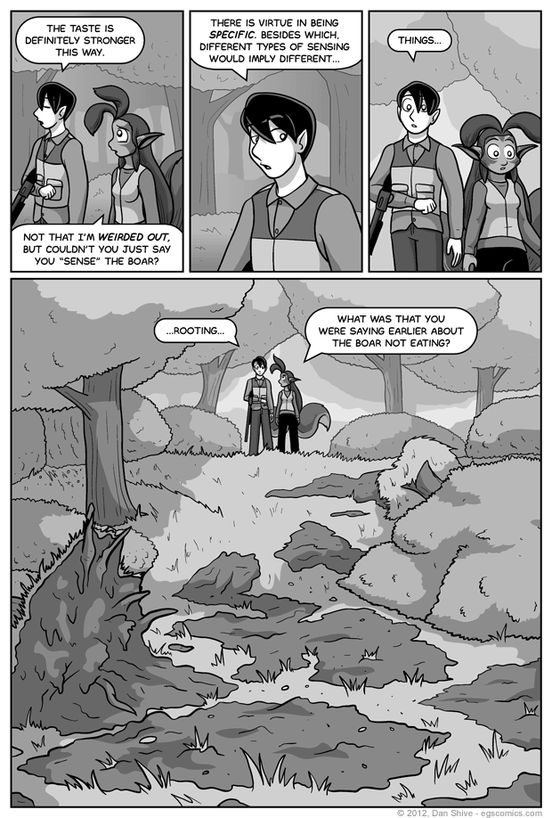 - "The ground's all dug up..."- Rooting for food- What he was saying earlier about not eatingI agree with Raven about being specific to an extent. I frequently try to be as specific as possible to prevent people from hearing subtext that doesn't actually exist. This is usually pointless, however, as people often stop listening once they pick up on the slightest hint of a pet peeve or something they've been waiting to talk about and fixate on that instead of the actual point of what's being said.