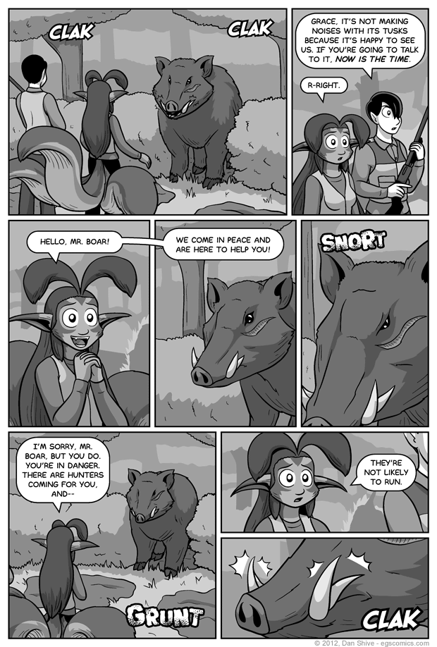 Clak about tusksThere's a darn good chance I've mentioned it in an earlier commentary, but boars sharpen their tusks every time they open and close their mouths. This is a piece of information that I keep trying to shove into the dialogue, but never really fits. This comic was the closest I've gotten to getting it to fit, but it just seemed more natural for Raven to focus on the sound and not the biology lesson of boar tusk sharpening.
