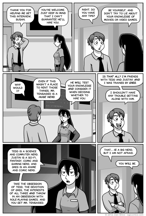 There are two posters per window with content visible from outside the store (only see the white backs while inside), however, and several TVs throughout the store. Two are visible in this comic, and while they're off for now, I do plot to put whatever random things strike my fancy into them when convenient. I can claim pretty much anything being shown is either a movie or a trailer for a movie, so I hope to have some fun with them.