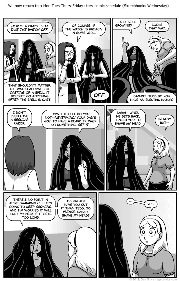 Wait, how long would her hair have to get before that's a problem? Because it's already pretty... Eh, never mind. Point's about to become moot anyway.