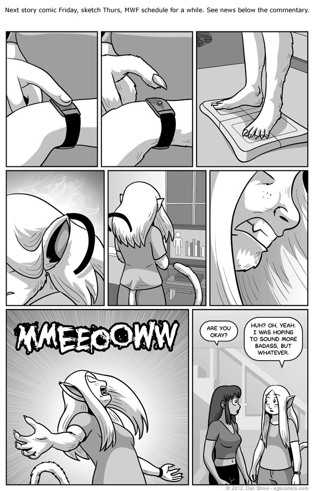 This conundrum wound up answering itself upon the realization that there were two primary details that needed showing beyond her becoming part-kitty. Those details were a) her hair growing long, and b) the fact that Tedd's not just collecting data via visual observation.