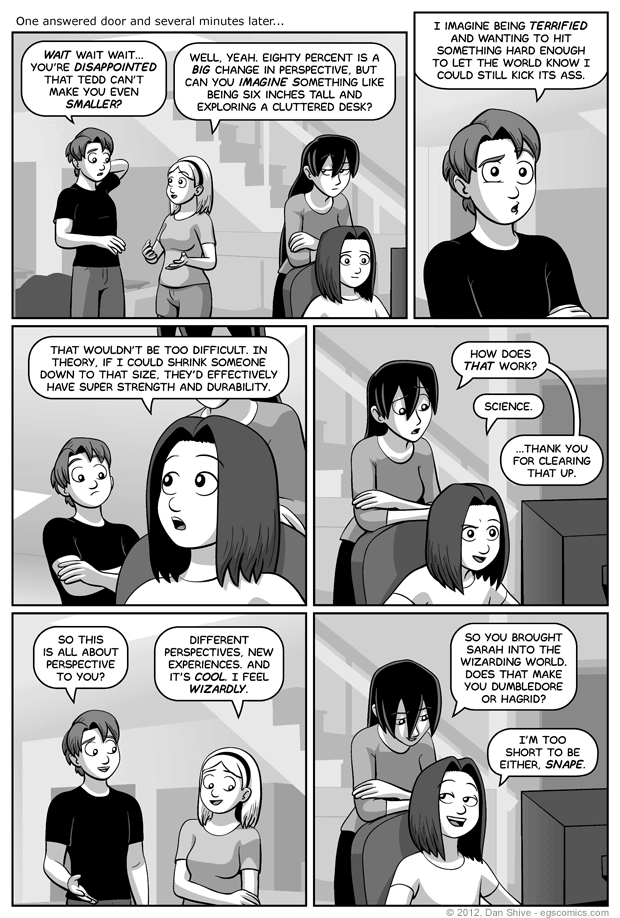 Speaking of size differences, there actually are scientific reasons why shrinking would, in theory, make someone proportionately stronger. I would elaborate, but it's late as I write this and that thing in my head that does the thinking is being a bit uncooperative. Perhaps in a future commentary.