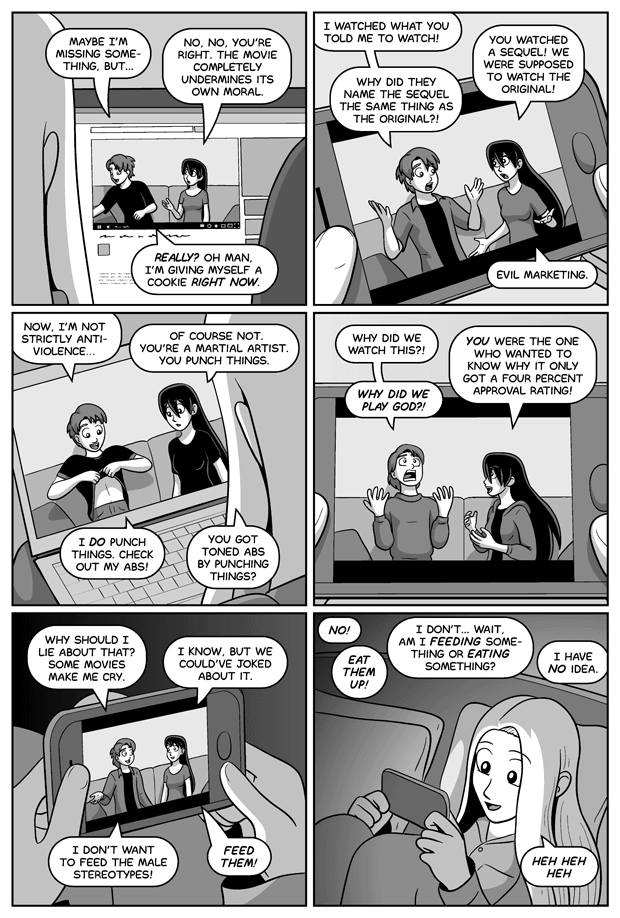 - 4% approval ratingI'm just going to let people reach their own conclusions about what movies they're discussing in this comic. Well, except for panel four's movie. I've already talked about what inspired that in the
