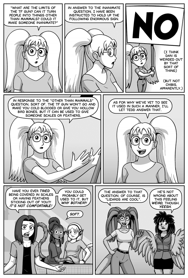 Bird morphs could be cool, but there's no way they could actually fly without additional magic, and I dunno about beaks, AND there's the issue of where their wings would go. I mean, in theory, a bird person should have wings in place of their arms, but THAT weirds me out, too! So then I'd give them wings on their back, but since it'd be via the TF gun, I'd have to wonder how the actual anatomy of that would work, and my head would hurt, and I don't know how to finish this paragraph or this commentary so it's just going to end awkwardly like so...!