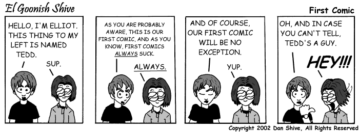 Welcome to El Goonish Shive! This little area down here is devoted to spoiler-free commentary of past and present comics. Most of the comics in the archive don't currently have commentary, but I only started adding commentary in 2008, so it should be no surprise that there isn't much commentary before that year. For now, anyway (now being June 21, 2008). ...Oh, SNAP, was that a spoiler?! Uh, did I say 2008? I meant to say "at some point well after the comic started in 2002, I started adding commentary." GAH! That's still sort of a spoiler! Okay, screw it. One might find minor spoilers down here. Mostly I'll just discuss behind the scenes stuff and possibly comment upon what I like or don't like about a particular comic, but I won't be dropping nuggets of plot twist hints. Anyway, this is the first comic that was ever posted on the site. Minor spoiler: the art and writing improve drastically over time.