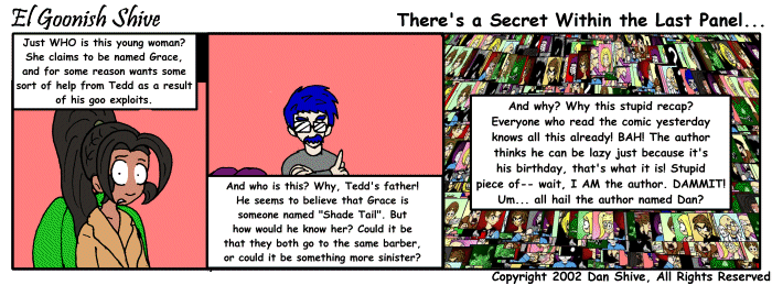 And yes, there is a secret in the last panel. I reveal what it is in a future comic, however, and it is a spoiler, so that’ll have to wait. It’s actually pretty cool, though, and it is something that shows just how far I plan things ahead in advance, even back in 2002.