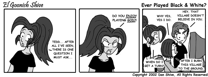 I would recommend it, but aside from it being a computer game that might be difficult to get to run on modern computers, it wouldn’t surprise me if it hasn’t aged well. I wouldn’t say it was all that spectacular in the first place, but, you know. Throwing villagers and petting giant monsters. Good times.