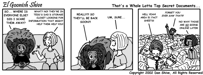 Huh. I guess Elliot knows the truth about Area 51 now. If I remember correctly, he makes some mention of it later, but I’m not certain. It’s possible I only planned to reference what he saw and never did… And if so, THAT JOKE’S STILL ON THE TABLE! I guess I’ll find out in the process of making more of these commentaries.