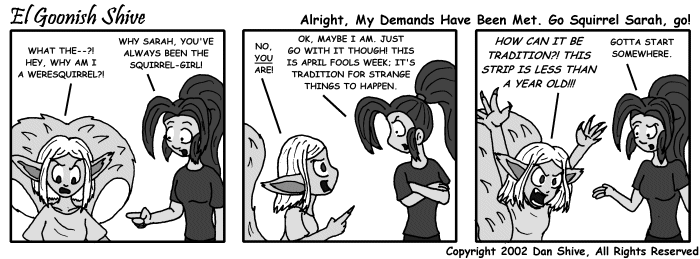 Whatever my motivations for ongoing April Fools mayhem, I distinctly remember wanting to draw Sarah as a squirrel girl. It’s entirely possible the only real reason this thing became a week.