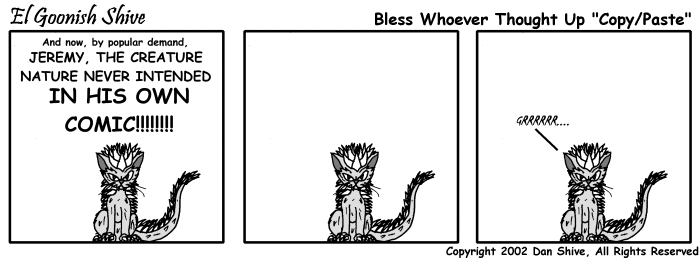 Jeremy is a cat, or at least cat-like. He likes to say “mereow”. It’s like a regular “meow”, but “mer”. Jeremy is not, however, a mer-cat, and good thing, too. Mer-cats are generally a grumpy lot, as they’re cats who live under the sea. That is not a good combination. Anyway, “mereow” is like a regular meow, but with a sort of accent to it.