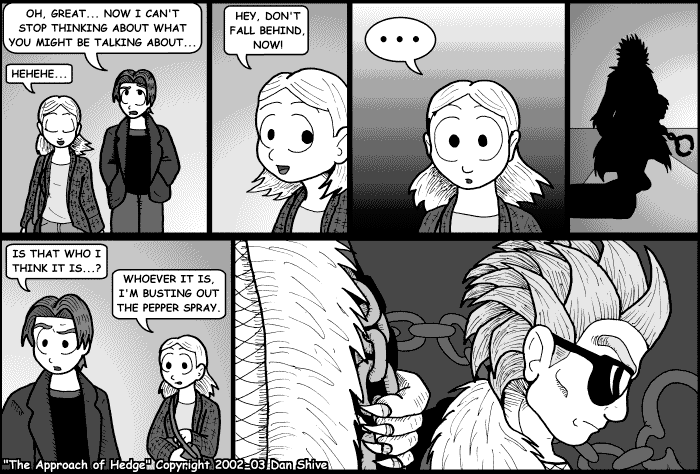 Sarah has pepper spray? I guess so. I wound up researching that sort of thing as a possibility for a later storyline, and that sort of stuff is nasty. I'm not 100% sure it would be legal for Sarah to carry that stuff around at this point in the story.