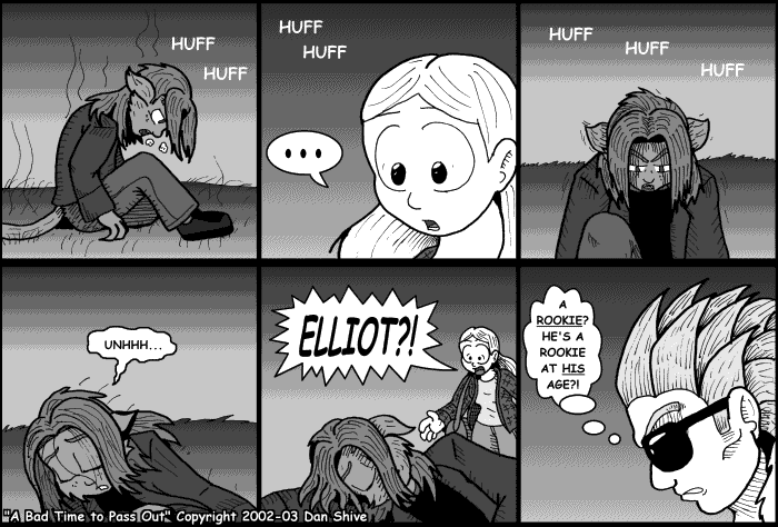 This one has something for to clarify, however, so YAY! Hedge thinks Elliot is like Grace, so his expectation is that Elliot would simply be dizzy after transforming. Instead we have, well, kitty down.