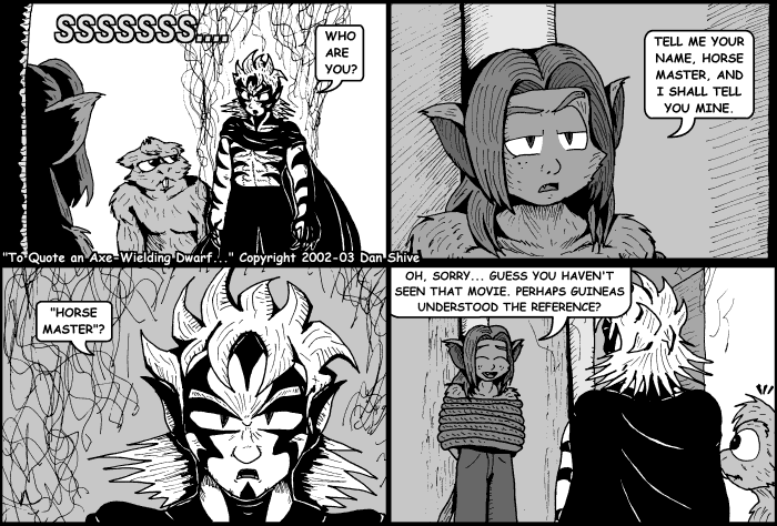 You know what? Moving on. Elliot's quoting Lord of the Rings. At least, he's quoting the second movie. I have no idea if that quote is anywhere in the books. I would like to claim I've read them all like a good little fanboy, but nope. I've attempted to listen to the audiobooks, but then Tom Bombadil happened, and I just... And now it's been too long since I've listened. I'd need to start over, and he'd be BACK!