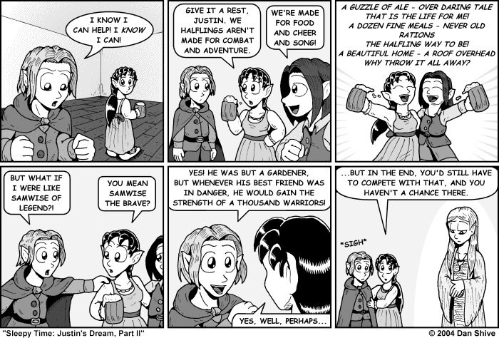 Given the series obsession with song and the fact that I was parodying it here, I felt I had to include at least few lines of a song. I don't think LOTR is prone to musical style singing where everybody just magically knows the words, at least not without a wizard's help, so these hobbit versions of Susan and Tedd must have sung this song together before. That ale they're drinking must be some potent stuff.