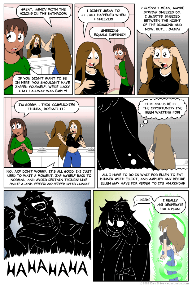 Incidentally, for those of you who consider the whole breast enlargement aspects of this overly explicit, it will please you to know (and infuriate others) that I cut back a bit on how risqué this comic is. Originally, Ellen was lifting up her shirt in panel five, and Magus was rudely obscuring the reflection that would have provided the frontal view. So really, nothing major would be seen either way, but the SUGGESTION of additional naughtiness would have been there.
