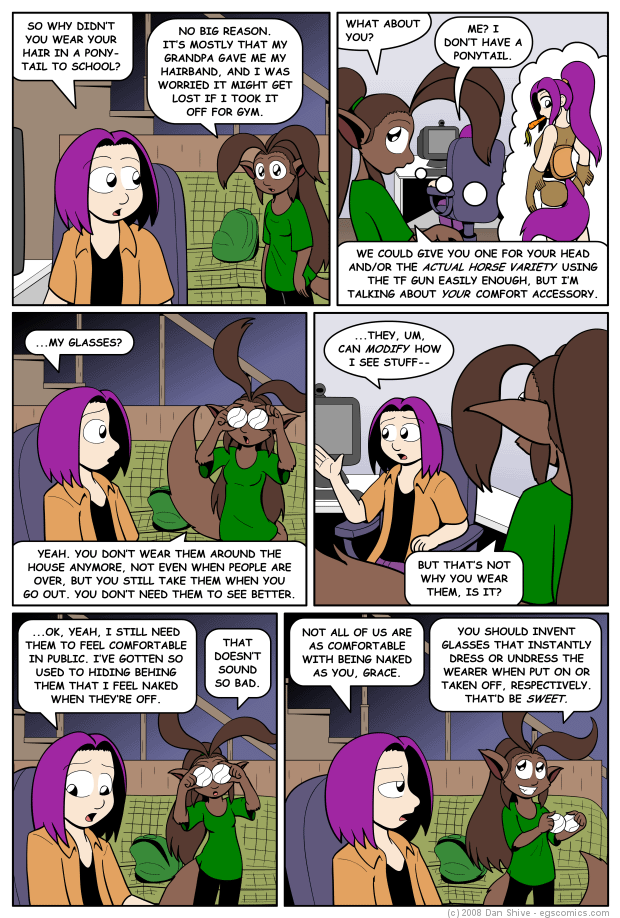 Yes, Orange. I want to give the cast a variety of outfits, particularly now that the comic is in color. The orange is meant to be like peanut butter, which is mean to compliment Tedd's purple "jelly colored" hair. Oh, and ah, "Pony Tedd". I dunno. Grace was just gonna say something about a normal ponytail, and it just sorta escalated somehow. I dunno. You'd have to ask her.