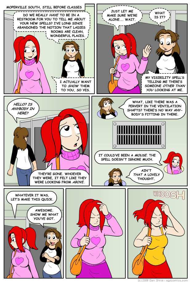 The purpose of that cut page? Establishing that Nanase was going to show Ellen her magic in the ladies room, and confirm that Nanase learned more than one new spell. Instead, Ellen establishes both in the first panel of this comic. I'm just glad I realized I could do that before drawing the cut page.