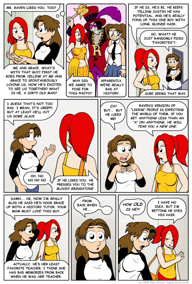 To make the visual work for the context, there needed to be girls included, which was almost a deal breaker. The idea of drawing Ellen and Nanase as hookers, even in a fantasy sequence, sickened me. I almost dropped the "Pimp Raven" panel altogether when I realized I could add a verbal joke to the visual that makes it clear that they're not hookers. This version remains disturbing, but it's not so bad that I have a problem showing it as a fantasy sequence.