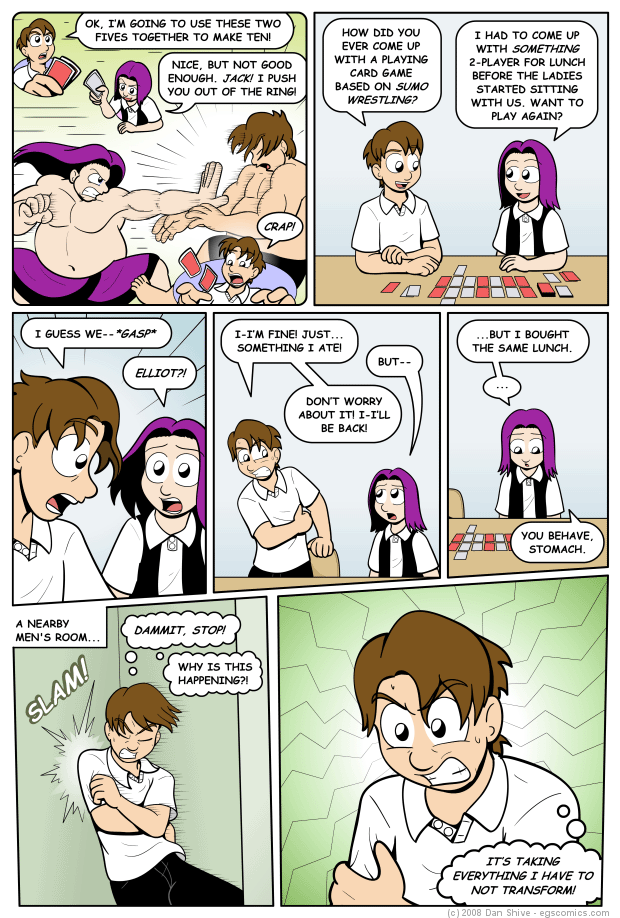 While I did recently do a review of a bean bag chair with the word "sumo" associated with it (Future edit: A review that I don't seem to have anymore), the game in this comic has nothing to do with that. The game they're playing is an actual playable game that I invented in High School for pretty much the same reason Tedd said, except in my case it was for a study hall period. As with most card games, it is ideally played from opposite sides of the table; Elliot and Tedd are positioned as they are simply for artistic convenience.