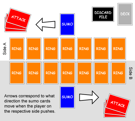 When pushing an opponent, the sumo cards are moved towards your side of the ring. If your opponent pushes you, the sumo cards move towards their side of the ring. If the sumo cards are pushed outside of the ring, then the player who last pushed the other player wins.