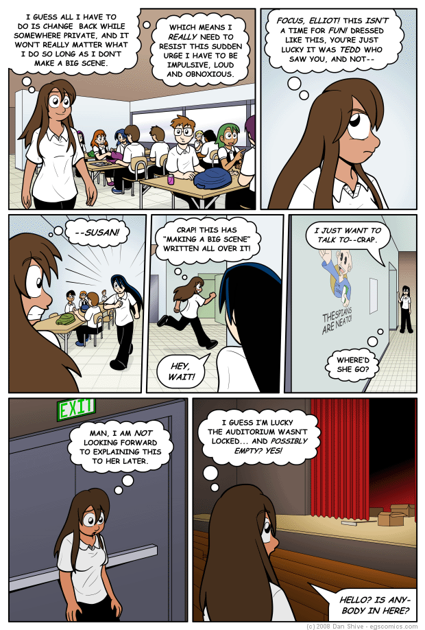 Which, incidentally, really makes me wish I'd done a better job with panel five. I mean, it looks okay, but it doesn't convey what I wanted as well as I would've liked. Specifically, I wanted to show a long hallway, Susan from the front (for contrast with previous panel), and the door to the auditorium. As the last panel shows, the door frame should probably be a fair bit farther down based on the size of the auditorium.