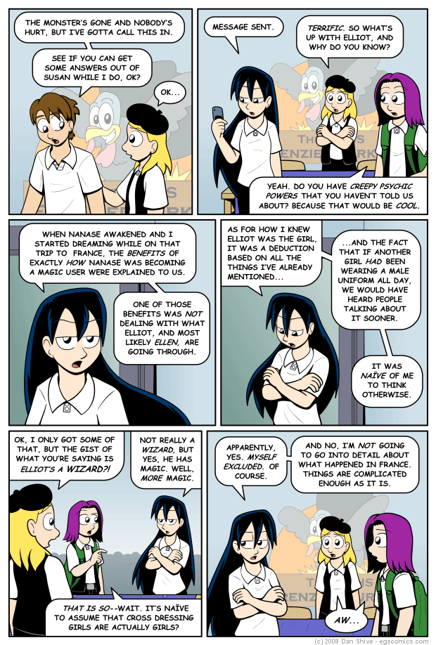 El Goonish Shive Introductions The Goo Shade, Part 1 Q&A #1 Shade, Part 2 Relations, Part 1 April Fools Week Relations, Part 2 Catnip Sister Part 1 - Open The Box Part 2 - Read The Rules Part 3 - Set Up The Pieces Part 4 - Play The Game Part 5 - Knock The Board Over Part 6 - Scattered Pieces Part 7 - Fist Fight Part 8 - Clean Up New And Old Friends Flipping Cardboard Lady Mysterious II slooF lirpA Squirrel Diplomacy Lunchtable Revelations Night Out Part 1 - Martial Arts Crew Part 2 - Elliot's Crew Part 3 - Ellen's Crew The Morning After Q&A #2 Tam Eh Tedd Painted Black Part 1 - Walk In The Park Part 2 - Missing Persons Part 3 - Interviewed By The Devil Part 4 - Into The Dungeon Part 5 - The Truth About Grace Part 6 - The Brewing Storm Part 7 - Fallen From Grace Part 8 - Humanity PB Special Features Shadows After Dark Sleepy Time Second Life The Child Left Behind Red Alert Before The Party Moping Squirrel Intro to South Party Recruiting Even More Recruiting Party Fashion Family Reuinion Grace's Birthday Party Part 1 - Arrivals And Presents Part 2 - Bending Genders Part 3 - Festivities Part 4 - Hold On Hope The After Party Q&A #3 Hidden Genesis Hidden Genesis In The Shadows The New Students Susan Draws The Line Squirrel In The Classroom Sister 2 Part 1 - The Trials Of Susan Part 2 - The Statue Part 3 - Pent-Up Magic Part 4 - Evil Monkey Part 5 - Moperville News Part 6 - Weregirl Part 7 - The Dark Clouds Gather Part 8 - Talon vs. Scythe Part 9 - Wrath of God Part 10 - Pandoras Box Q&A #4 Q&A #4 Bringing Silly Back Indiana Elliot And The TOSF T-Minus The Demon Ally Hammerchlorians - 1 Hammerchlorians - 2 Hammerchlorians - 3 T-Minus Dark Allegiance New And Old Flames - 1 New And Old Flames - 2 New And Old Flames - 3 New And Old Flames - 4 New And Old Flames - 5 New And Old Flames - 6 Q&A #5 Q&A #5 9001% Serious One Way Road Legends of Celida Death Sentence - 1 Death Sentence - 2 Death Sentence - 3 Death Sentence - 4 Death Sentence - 5 What Is Love Summer The End Of Spring Power Fantasy Rocks Fall Nobody Is Hired Nepotism Hair By The Numbers Duel Of The Discs There Be Whales Here There Be Whales Here Pt 2 There Be Whales Here Pt 3 The Dawn End Of An Era End Of An Era pt 2 Family Tree Family Tree Part 2 - Arrival Family Tree Part 3 - Par-TAY Family Tree Part 4 - Weirdness Family Tree Part 5 - A Troll Family Tree Part 6 - Banhammered Family Tree Part 7 - Hangover Q&A #6 Identity Identity Part 2 - Reactions Identity Part 3 - Cat Attack Identity Part 4 - Detective Sarah Identity Part 5 - Basement Chat Identity Part 6 - ILLOGICAL! Identity Part 7 - Dreams identity Part 8 - Ashley Identity Part 9 - Detective Susan Identity Part 10 - Ashley and Elliot Identity Part 11 - Epilogue Summer Moments Guest Comics Guest Comics #1 Guest Comics #2 Pandoras Box Squirrel Prophet SP - Part 2 SP - Final Battle So A Date At The Mall So A Date - Part 2 So A Date - Part 3 So A Date - Part 4 So A Date - Part 5 EGSNP - Question Mark Q&A 7 - The Requestioning Sister 3 - Catspaws Part 1 - Legacy Part 2 - The Will of Magic Part 3 - Reply Hazy Part 4 - Everyone Needs To Talk Part 5 - The Reservoir Part 6 - Maybe Sisters Part 7 - An Unkindness Part 8 - Awkwardness Ahead Part 9 - Traffic Freeze Part 10 - Fluidity Part 11 - All Of The Curse Words Part 12 - Misanthropy Part 13 - In Search Of Wisdom Part 14 - Sister Anxiety Part 15 - Elliot and Ellen Part 16 - BFFs Part 17 - Great Fairy Godmother Part 18 - Gathering Monsters Part 19 - Family Meetings Part 20 - Geminis Part 21 - The Other Dunkel Part 22 - Apocalypse Part 23 - The Fate Of Magic Part 24 - Elliots And Ellens Part 25 - Changes Part 26 - Epilogues The New World The Legend of Diane The Secret of Sam Q&A 8 - The Lord Of The Q&As Title Pending Title Pending 2 - Even More Pending Title Pending 3 - Untitled Party Title Pending 5 or 6 Balance Part 1 Part 2 Part 2-B Part 3 Part 4 Part 5 Part 6 Part 7 Part 8 Part 9 The Road Ahead Brother Father Our Future Recruitment Layers, Part 1 Layers, Part 2 Layers, Part 3 Layers, Part 4 Hope, Part 1 Hope, Part 2 Hope, Part 3 Hope, Part 4 Hope, Part 5 Hope, Part 6 Hope, Part 7 Hope, Part 8 Hope, Part 9 Hope, Part 10 Hope, Part 11 Hope, Part 12 False Kings False Kings, Part 1 False Kings, Part 2 False Kings, Part 3 False Kings, Part 4