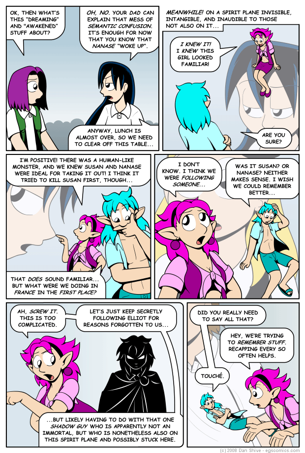 El Goonish Shive Introductions The Goo Shade, Part 1 Q&A #1 Shade, Part 2 Relations, Part 1 April Fools Week Relations, Part 2 Catnip Sister Part 1 - Open The Box Part 2 - Read The Rules Part 3 - Set Up The Pieces Part 4 - Play The Game Part 5 - Knock The Board Over Part 6 - Scattered Pieces Part 7 - Fist Fight Part 8 - Clean Up New And Old Friends Flipping Cardboard Lady Mysterious II slooF lirpA Squirrel Diplomacy Lunchtable Revelations Night Out Part 1 - Martial Arts Crew Part 2 - Elliot's Crew Part 3 - Ellen's Crew The Morning After Q&A #2 Tam Eh Tedd Painted Black Part 1 - Walk In The Park Part 2 - Missing Persons Part 3 - Interviewed By The Devil Part 4 - Into The Dungeon Part 5 - The Truth About Grace Part 6 - The Brewing Storm Part 7 - Fallen From Grace Part 8 - Humanity PB Special Features Shadows After Dark Sleepy Time Second Life The Child Left Behind Red Alert Before The Party Moping Squirrel Intro to South Party Recruiting Even More Recruiting Party Fashion Family Reuinion Grace's Birthday Party Part 1 - Arrivals And Presents Part 2 - Bending Genders Part 3 - Festivities Part 4 - Hold On Hope The After Party Q&A #3 Hidden Genesis Hidden Genesis In The Shadows The New Students Susan Draws The Line Squirrel In The Classroom Sister 2 Part 1 - The Trials Of Susan Part 2 - The Statue Part 3 - Pent-Up Magic Part 4 - Evil Monkey Part 5 - Moperville News Part 6 - Weregirl Part 7 - The Dark Clouds Gather Part 8 - Talon vs. Scythe Part 9 - Wrath of God Part 10 - Pandoras Box Q&A #4 Q&A #4 Bringing Silly Back Indiana Elliot And The TOSF T-Minus The Demon Ally Hammerchlorians - 1 Hammerchlorians - 2 Hammerchlorians - 3 T-Minus Dark Allegiance New And Old Flames - 1 New And Old Flames - 2 New And Old Flames - 3 New And Old Flames - 4 New And Old Flames - 5 New And Old Flames - 6 Q&A #5 Q&A #5 9001% Serious One Way Road Legends of Celida Death Sentence - 1 Death Sentence - 2 Death Sentence - 3 Death Sentence - 4 Death Sentence - 5 What Is Love Summer The End Of Spring Power Fantasy Rocks Fall Nobody Is Hired Nepotism Hair By The Numbers Duel Of The Discs There Be Whales Here There Be Whales Here Pt 2 There Be Whales Here Pt 3 The Dawn End Of An Era End Of An Era pt 2 Family Tree Family Tree Part 2 - Arrival Family Tree Part 3 - Par-TAY Family Tree Part 4 - Weirdness Family Tree Part 5 - A Troll Family Tree Part 6 - Banhammered Family Tree Part 7 - Hangover Q&A #6 Identity Identity Part 2 - Reactions Identity Part 3 - Cat Attack Identity Part 4 - Detective Sarah Identity Part 5 - Basement Chat Identity Part 6 - ILLOGICAL! Identity Part 7 - Dreams identity Part 8 - Ashley Identity Part 9 - Detective Susan Identity Part 10 - Ashley and Elliot Identity Part 11 - Epilogue Summer Moments Guest Comics Guest Comics #1 Guest Comics #2 Pandoras Box Squirrel Prophet SP - Part 2 SP - Final Battle So A Date At The Mall So A Date - Part 2 So A Date - Part 3 So A Date - Part 4 So A Date - Part 5 EGSNP - Question Mark Q&A 7 - The Requestioning Sister 3 - Catspaws Part 1 - Legacy Part 2 - The Will of Magic Part 3 - Reply Hazy Part 4 - Everyone Needs To Talk Part 5 - The Reservoir Part 6 - Maybe Sisters Part 7 - An Unkindness Part 8 - Awkwardness Ahead Part 9 - Traffic Freeze Part 10 - Fluidity Part 11 - All Of The Curse Words Part 12 - Misanthropy Part 13 - In Search Of Wisdom Part 14 - Sister Anxiety Part 15 - Elliot and Ellen Part 16 - BFFs Part 17 - Great Fairy Godmother Part 18 - Gathering Monsters Part 19 - Family Meetings Part 20 - Geminis Part 21 - The Other Dunkel Part 22 - Apocalypse Part 23 - The Fate Of Magic Part 24 - Elliots And Ellens Part 25 - Changes Part 26 - Epilogues The New World The Legend of Diane The Secret of Sam Q&A 8 - The Lord Of The Q&As Title Pending Title Pending 2 - Even More Pending Title Pending 3 - Untitled Party Title Pending 5 or 6 Balance Part 1 Part 2 Part 2-B Part 3 Part 4 Part 5 Part 6 Part 7 Part 8 Part 9 The Road Ahead Brother Father Our Future Recruitment Layers, Part 1 Layers, Part 2 Layers, Part 3 Layers, Part 4 Hope, Part 1 Hope, Part 2 Hope, Part 3 Hope, Part 4 Hope, Part 5 Hope, Part 6 Hope, Part 7 Hope, Part 8 Hope, Part 9 Hope, Part 10 Hope, Part 11 Hope, Part 12 False Kings False Kings, Part 1 False Kings, Part 2 False Kings, Part 3 False Kings, Part 4