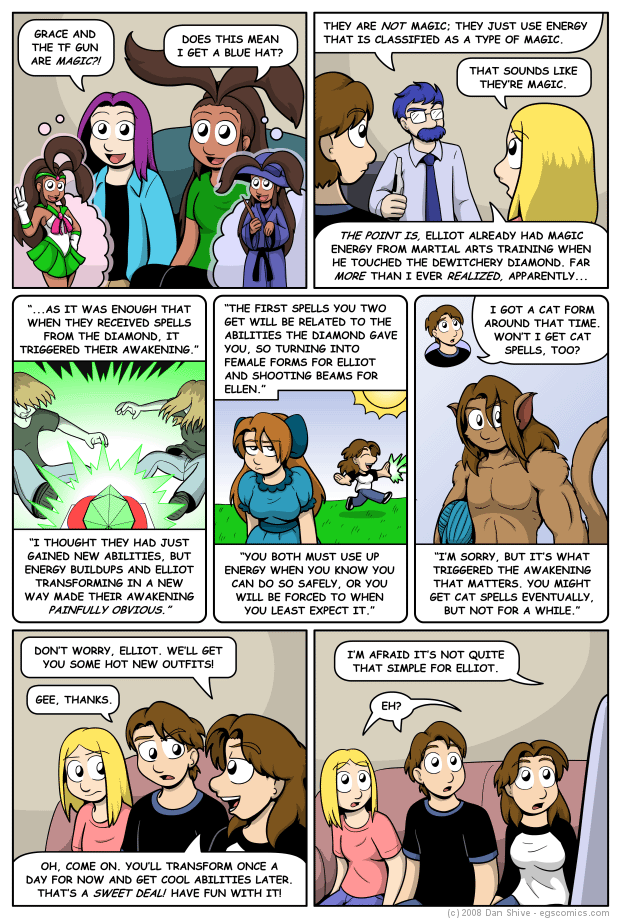 This comic may feel like mostly summary, particularly to the hardcore fans, but there are some key things here. For one, precisely why Mr. Verres didn’t realize Elliot and Ellen could have awakened sooner, and why Elliot is starting out with girly spells without cat spells. Granted, one could figure out without this comic why Elliot wasn’t getting cat spells, but that’s dependant on how one interprets Nanase’s earlier "related to the incident" line. Why Elliot isn’t getting kitty spells has been asked quite frequently since that comic.