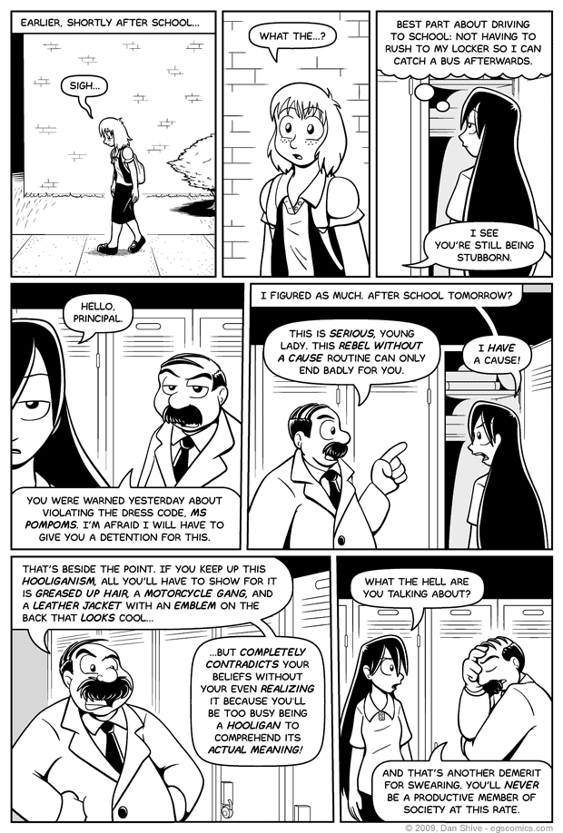 This page has had many versions to it, and was almost left out. It occurred to me that, in spite of being a key antagonist in it, North’s principal had not shown up at all during the Sister II arc, and it was high time he did. In addition, Susan had not yet been punished for violating the dress code.