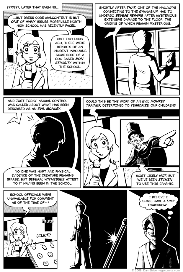 The whole evil monkey trainer bit is something I've been itchin' to include. The bloodgrem's physical form was based off of monkeys so it could be animal-like with human characteristics, and I needed people to refer to it as an animal, so it was very organic for it to eventually be referred to as an evil monkey. The TV show