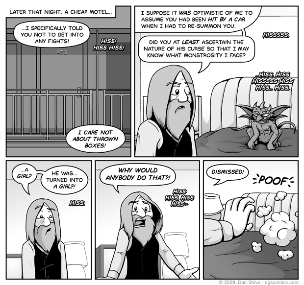 Title: Dirty Minded Bloodgrem? [rule] "Who IS This Guy?" reference: [[2008-05-26|The Statue]], [[2008-11-06|Sensing Something]] I'm not sure exactly what the Bloodgrem's answer to this guy's question is in panel four, but given panel five, it was probably something Tedd would appreciate. This is the first comic since I've switched to the portrait format where I'm not forcing myself to match the online updates to hypothetical print pages. In other words, an update can be less than a page, more than a page, whatever works best as an update. This allows me a LOT more layout freedom, makes the comic easier to write, and should allow for more frequent updating. I'll have more to say about the benefits of this approach when I actually have something more to show for it. This is both to walk the walk in addition to talking the talk, and also because the best examples would be potentially spoilertastic if brought up now.