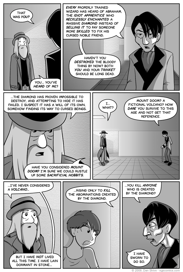 TITLE: Nerves Touched... [rule] Ok! Now we now why he hasn't just destroyed the Dewitchery Diamond. STOP ASKING! ^^; I've been waiting ever so long to have Raven bring up tossing the diamond into Mount Doom. EVER so long. It feels good to have it done with. This Abraham is named after Abraham from the Bible. The EGS Abraham is killing those borne from the diamond he created, while the Biblical Abraham was asked by God to sacrifice his son. Biblical Abraham's situation is quite a bit different from EGS's Abraham (one key difference being actually TOLD by God to do something), and my character is in no way intended to reflect or represent the Biblical one. Nonetheless, I couldn't think of a more appropriate name.