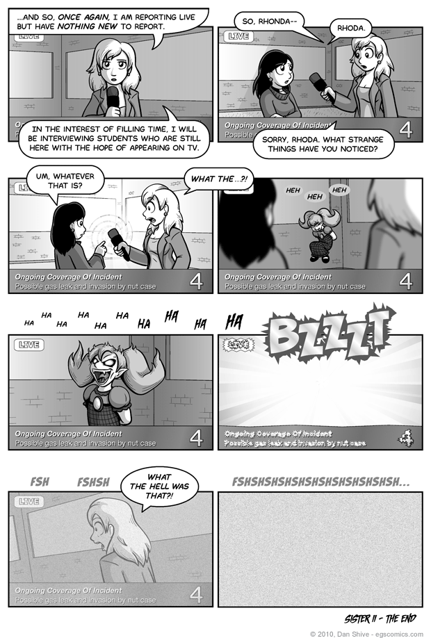 TITLE: Supernatural Pin Drop The odd panel sizes for this page is to keep the panels proportional to what one would see on a widescreen TV to further emphasize the idea that what's being shown in the comic is what people within the comic universe are seeing themselves on live television. But enough about that technical mumbo-jumbo. The most important thing about this comic is, obviously, panel two. Her name is Rhoda, not Rhonda! There is no "n"! For that matter, it's Magus, not Magnus! What's with these added n's I keep seeing when people talk about these characters?! There's no "n" in either name! GAAAAAAH! I will note that Rhoda and Carol the news reporter weren't hurt, but they were bewildered. If you wish to purchase "sorry you got bewildered" cards for them, I believe they are sold at most major retailers.