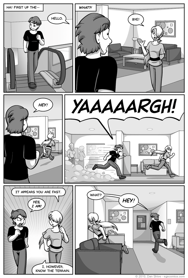 I did not design detailed, reusable sets for this scene. Thanks to Noah's messing with things, they're passing by everything too quickly for it to make sense for them to be designed for every angle. Instead, I worked around the characters and only concentrated on views that would be shown in this comic.