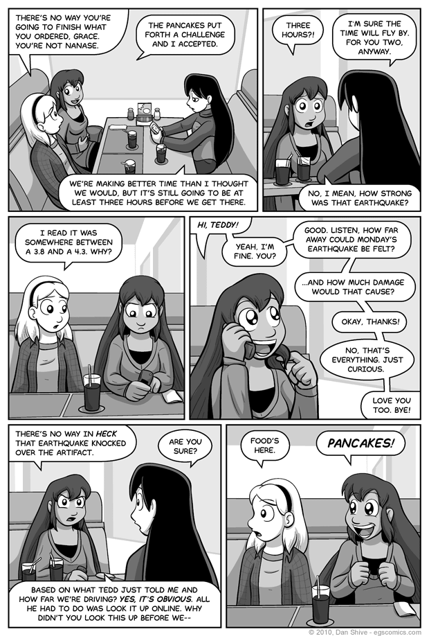 While this storyline has been in my mind for a long time, the earthquake angle was a relatively recent addition. I mentioned in a previous comic's commentary that there was a small earthquake close enough to where I live for me to feel it, which inspired me to include one in this storyline.