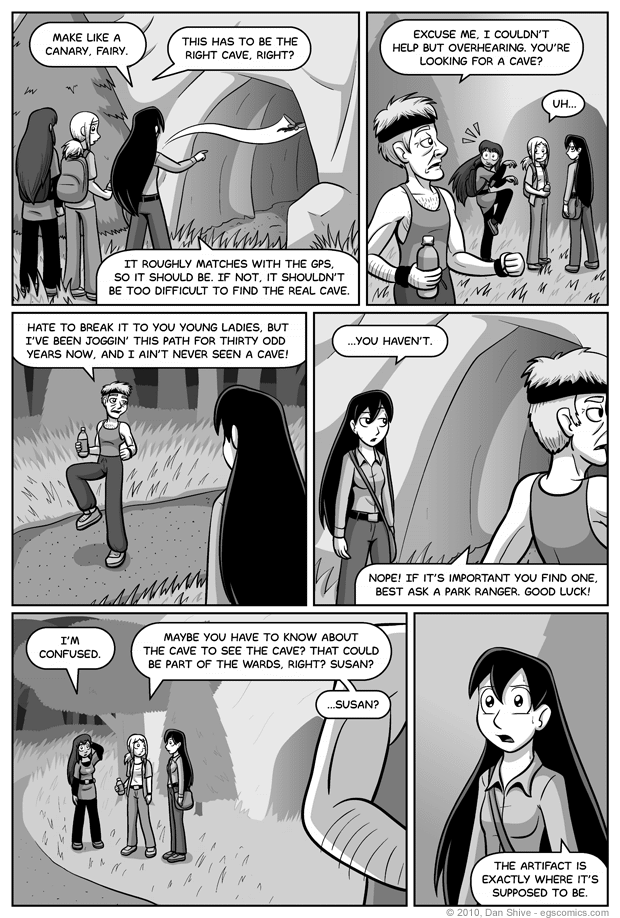 This comic was way more difficult for me to make than it should have been. There were several reasons for this, including non-comic obligations that also delayed the previous comic, weather, a power outage, the assumption that this comic would demand more panels to get the timing right (for example, I originally pictured a text-free panel with Sarah, Susan and Grace with the cave behind them in response to "I ain't never seen a cave"), and then there was the matter of personal angst and lack of sleep.