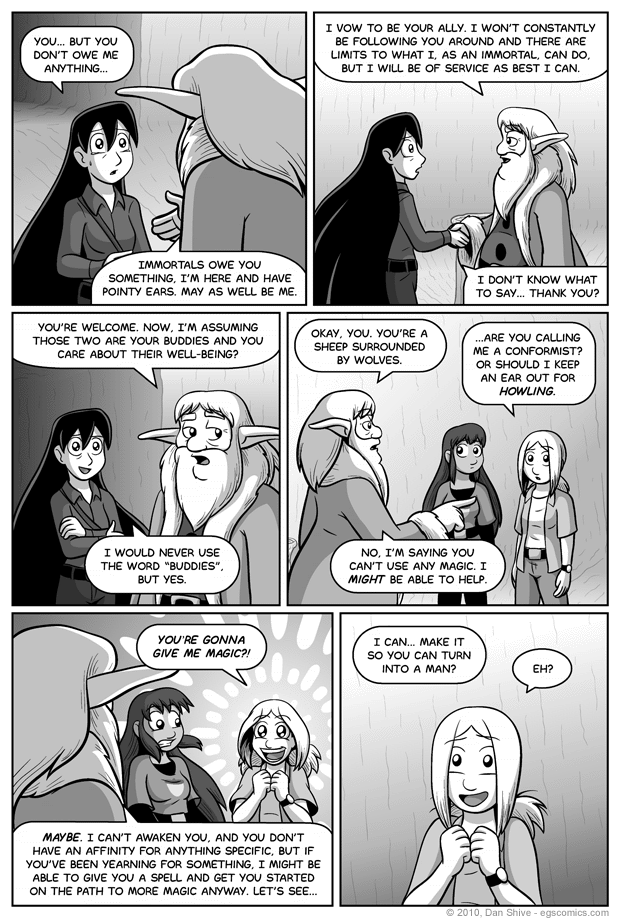 There has been an ongoing debate regarding whether Sarah should get magic. It has existed before Sarah ever officially expressed an interest in magic, but it's kicked into high gear since then. And now we have a comic ending on a cliffhanger that could result in Sarah getting magic but could easily go either way. Hehehe. Ha ha ha.MUH-HAHAHAHAHA~! ,,, Ha. Okay, in all seriousness, I am SO hiding from the forums this week.