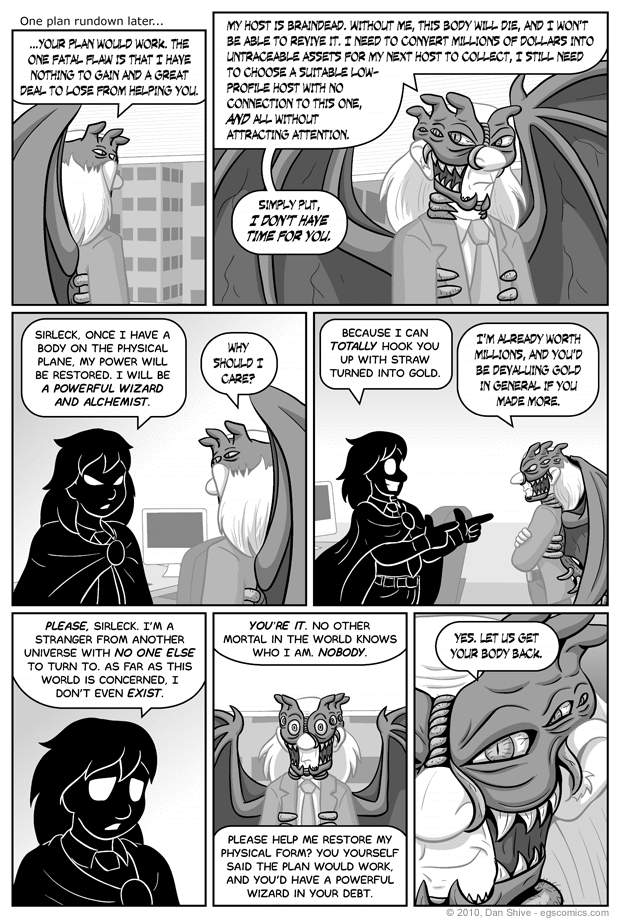 My unwavering faith in humanity tells me there's no chance whatsoever of either of these characters betraying the other. There are different ways I would like to have phrased Sirleck's dialogue in panel four, but each was less clear and potentially nonsensical if interpreted incorrectly. One way of putting it, for example, had the potential to be interpreted as Sirleck claiming that straw was more valuable than gold. As for why it would devalue gold, it's simple economics. The more plentiful and available something is, the less valuable it is. That's why people freak out over the government printing more money. I figure there are circumstances when they should do that, but it is the sort of thing that leads to inflation. I think, anyway. Did I keep my old economics textbook? I may need a refresher. The next comic starts a new storyline called Old And New Flames . While I think it will be an easy to follow storyline, it will touch on a LOT of dangling plot threads from previous years.