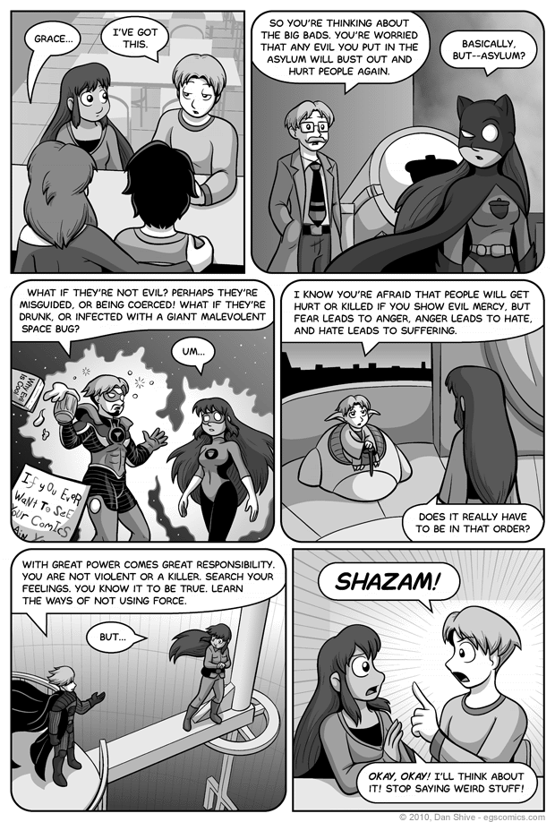 It's kind of cheating to have two Star Wars panels in a row, but hey, at least I reference Spider-Man's power and responsibility bit in panel five. It's also a bit odd that there's something of a time paradox going on. Grace is Anakin in panel four, but Justin is Vader in panel five while Grace has become Luke. I'm not sure how the time-space continuum hasn't exploded, but I think we're all still here...