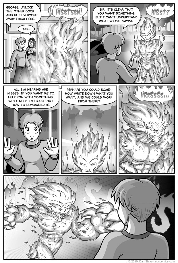 George doesn't get badass points for this comic, but really, how well would most of us taking seeing a fire monster outside our home or place of business? It would be somewhat unsettling. .01% of us would confront it, 5% us would hide, another 5% would run, and 89.99% of us would take photos with our camera phones and/or tweet about it.