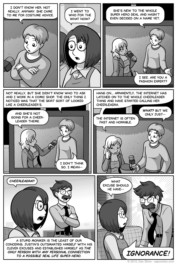 In any case, I grew attached to this ridiculous character, and I wanted to settle on at least a temporary name for Elliot's super hero form, so I went with Cheerleadra. Not only is there a personal significance, but there are joke opportunities, so I'm happy with it for now.