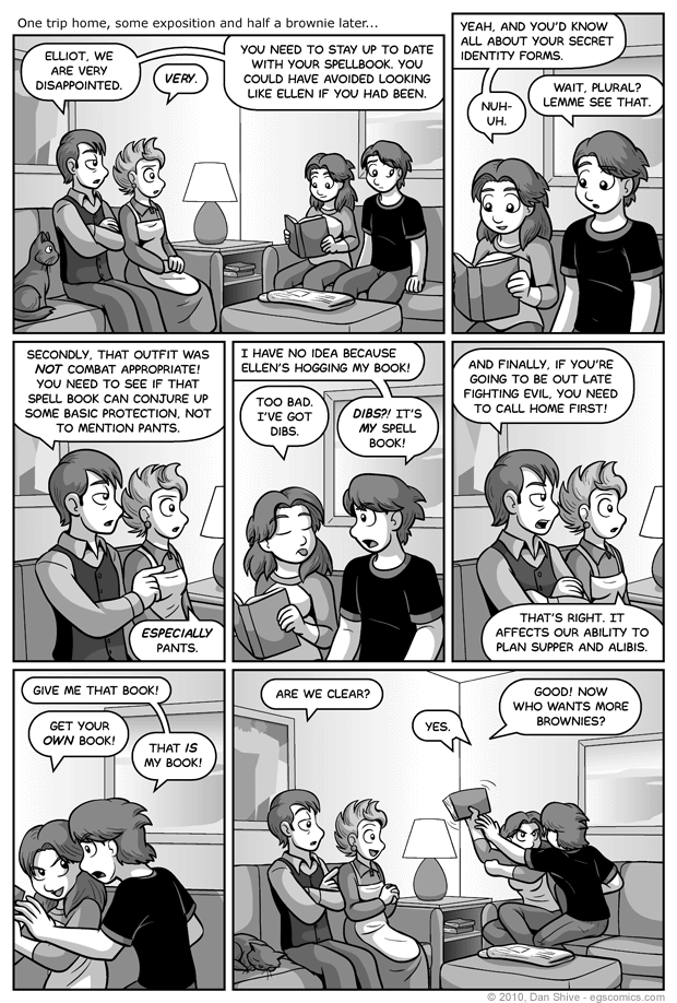 And, BORING PRODUCTION DETAILS! *applause* I probably could've been a lot lazier with this comic than I was. While some copy/paste did occur with some (not all) of the background elements, I didn't do that for any of the characters. With Elliot and Ellen, I clearly couldn't have done that, but with Mr. and Mrs Dunkel? I think it's probably better looking by virtue of not copying and pasting them from panel to panel, but I definitely could have gotten away with it. Kevin might've complained, but whatever.