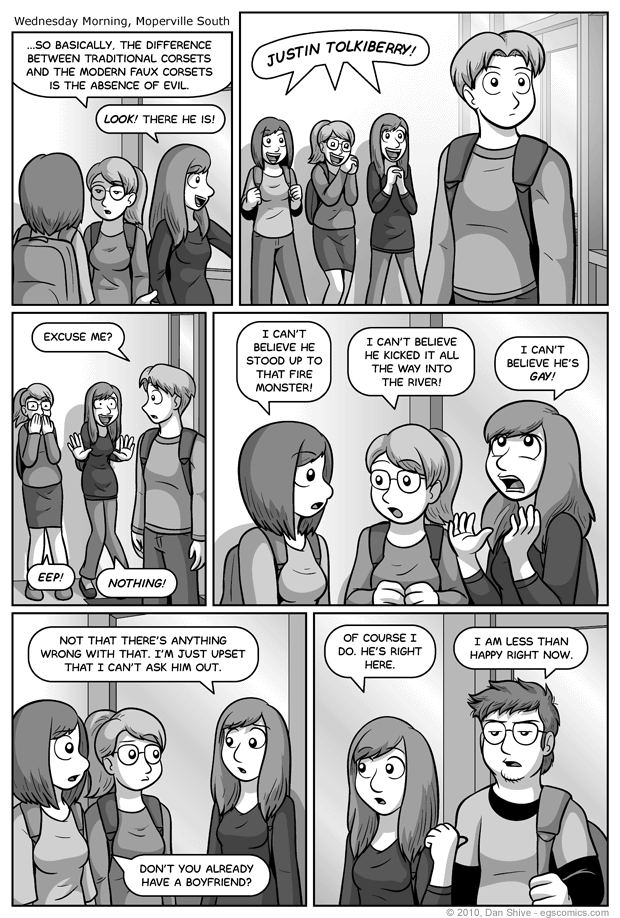 So instead, I'm going to focus on corsets. The dialogue in panel one was inspired by a conversation I had with a friend of mine. I had commented on how I thought corsets were evil, and not for a second did I expect my friend to disagree up until the point when she vehemently did.