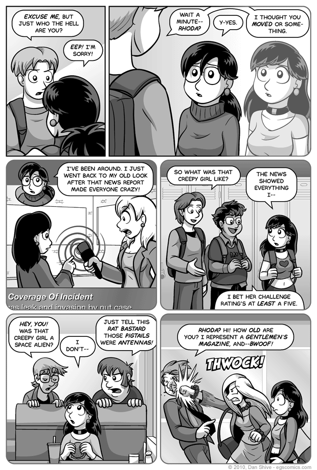 I've previously shown an image of Pandora being all creepy on the news in Bringing Silly Back, but it occurred to me that Rhoda's presence wasn't shown. According to my big list of rules of when to fling exposition and/or show previous scenes, panel three being a flashback was MANDATORY.